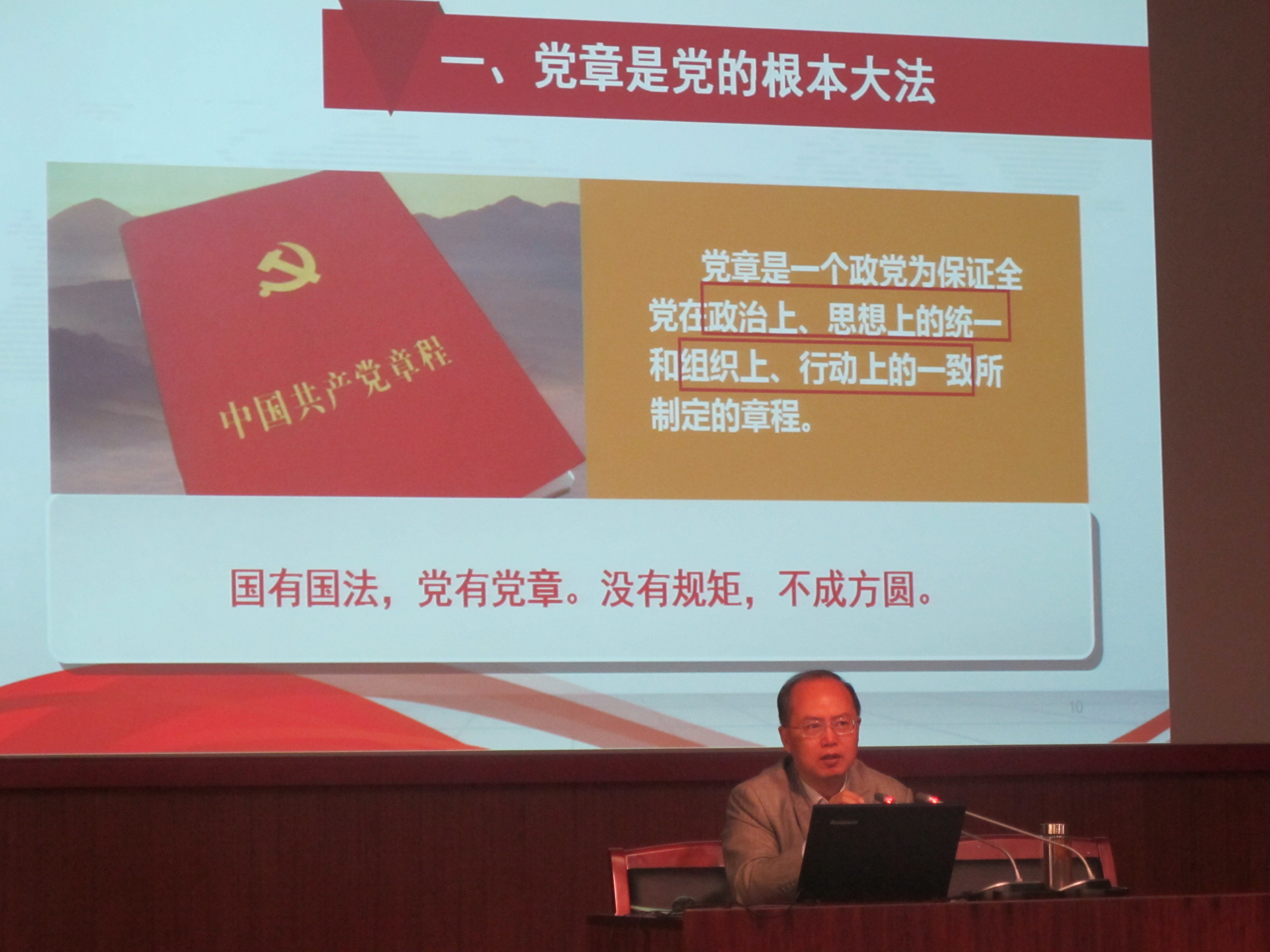 随后,王教授以王岐山同志“党纪严于国法”的表述作为引子,阐明“党章是从严治党的明镜”。他先介绍了严明党章党纪的重要性,接着围绕“坚定理想信念”谈了自己的观点。他先以习近平总书记关于理想信念的讲话开头,分析了共产党理想信念的科学内涵,其美好愿景是树立远大理想,要求党员掌握马克思主义理论,要求党员坚守政治红线与道德底线。王教授从“坚持远大理想与共同理想相结合”、“牢记马克思主义理论与党的宗旨”、“在实践中坚守政治红线与道德底线”三个方面具体讲解了党员应该如何坚定理想信念。其旁征博引,妙语连珠,赢得了现场观众的阵阵掌声。